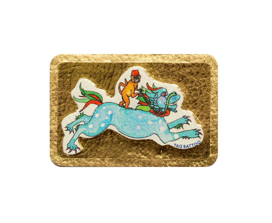 - This Chinese Foo-Lion and his monkey rider embossed on gold is deliciously quirky and full of fun and good omens.
